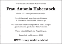 Wir trauern um unsere Mitarbeiterin Frau Antonia Haberstock die im 17. Lebensjahr verstorben ist. Frau Haberstock war als Auszubildende in unserem Unternehmen beschäftigt. Wir verlieren eine bei Vorgesetzten und Kollegen gleichermaßen geschätzte Mitarbeiterin. Unser Mitgefühl gilt den Angehörigen. Landshut, im Dezember 2025 BMW Group Werk Landshut