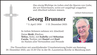 Das einzig Wichtige im Leben sind die Spuren von Liebe, die wir hinterlassen, wenn wir ungefragt weggehen und Abschied nehmen müssen. (Albert Schweitzer) Georg Brunner * 3. April 1959 + 13. Dezember 2025 In tiefem Schmerz nehmen wir Abschied: Deine Heidi, Ehefrau Tobias, Sohn, mit Isabella und Sebastian Carola, Tochter, mit Daniel und Emil im Namen aller Verwandten und Freunde Die Trauerfeier mit anschließender Urnenbeisetzung findet am Samstag, 20. Dezember 2025, um 10.30 Uhr in der St.-Laurentius-Kirche in Mainburg statt.