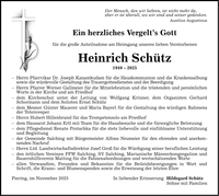 Der Mensch, den wir liebten, ist nicht mehr da,aber er ist überall, wo wir sind und seiner gedenken.Aurelius AugustinusEin herzliches Vergelt's Gottfür die große Anteilnahme am Heimgang unseres lieben VerstorbenenHeinrich Schütz***- Herrn Pfarrvikar Dr. Joseph Kanamkudam für die Hauskommunion und die Krankensalbung sowie die würdevolle Gestaltung des Trauergottesdienstes und der Beerdigung- Herrn Pfarrer Werner Gallmeier für die Mitzelebration und die tröstenden und persönlichen Worte in der Kirche und am Friedhof- dem Kirchenchor unter der Leitung von Wolfgang Krinner, dem Organisten Gerhard Schormann und dem Solisten Ernst Schütz- dem Mesner Günter Mauerer und Maria Bayerl für die Gestaltung des würdigen Rahmens der Totenvesper- Herrn Hubert Hillenbrand für das Trompetensolo am Friedhof- dem Hausarzt Johann Ertl mit Team für die Hausbesuche und die fürsorgliche Betreuung- dem Pflegedienst Renate Protschka für die stets liebevolle und einfühlsame Unterstützung und Begleitung- der Gemeinde Salching mit Bürgermeister Alfons Neumeier für den ehrenden und anerkennenden Nachruf- Herrn Ltd. Landwirtschaftsdirektor Josef Groß für die Würdigung seiner beruflichen Leistung- den örtlichen Vereinen FFW Salching, SV Salching, Marianische Männerkongregation und Bauernhilfsverein Matting für die Fahnenabordnungen und wertschätzenden Worte- allen Verwandten, Freunden und Bekannten für die Beileidsbezeigungen in Wort und Schrift, die Kranz- und Blumenspenden sowie die Erweisung der letzten EhrePiering, im November 2025In liebender ErinnerungHildegard SchützSöhne mit Familien