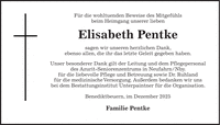 Für die wohltuenden Beweise des Mitgefühls beim Heimgang unserer lieben Elisabeth Pentke sagen wir unseren herzlichen Dank, ebenso allen, die ihr das letzte Geleit gegeben haben. Unser besonderer Dank gilt der Leitung und dem Pflegepersonal des Azurit-Seniorenzentrums in Neufahrn/Nby. für die liebevolle Pflege und Betreuung sowie Dr. Ruhland für die medizinische Versorgung. Außerdem bedanken wir uns bei dem Bestattungsinstitut Unterpaintner für die Organisation. Benediktbeuern, im Dezember 2025 Familie Pentke