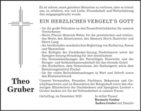 Es ist schwer, einen geliebten Menschen zu verlieren, aber es tröstet uns, zu erfahren, wie viel Liebe, Freundschaft und Wertschätzung ihm entgegengebracht wurde. Ein herzliches Vergelt's Gott - für die große Teilnahme an den Trauerfeierlichkeiten für unseren Verstorbenen - Herrn Pfarrer Heinrich Weber für die persönlichen und tröstenden Worte, den Ministranten, den Mesnern Herrn Hastreiter und Herrn Lang - der berührenden musikalischen Begleitung von Katharina, Simon und Maximilian - den Kollegen der Dachdecker-Innung Niederbayern sowie der Spengler-Innung Straubing für ihre Anteilnahme - den Vereinsabordnungen der Freiwilligen Feuerwehr und der Krieger- und Soldatenkameradschaft für das ehrende Geleit - den Ersthelfern, dem Notarztteam, der Seelsorgerin sowie dem Bestattungsinstitut Fischer - für die vielen Beileidsbekundungen in Wort und Schrift sowie den Blumenschmuck Unseren Verwandten, Freunden, Nachbarn, Bekannten und Geschäftspartnern und im Besonderen der Belegschaft sowie den ehemaligen Mitarbeitern der Dachdeckerei und Spenglerei Leutner + Gruber danken wir für die Verbundenheit in unserer Trauer. Geltolfing, im Dezember 2025 In stiller Trauer: Rosmarie Gruber Andrea Gruber mit FamilieTheo Gruber