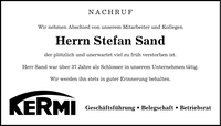 NACHRUF Wir nehmen Abschied von unserem Mitarbeiter und Kollegen Herrn Stefan Sand der plötzlich und unerwartet viel zu früh verstorben ist. Herr Sand war über 37 Jahre als Schlosser in unserem Unternehmen tätig. Wir werden ihn stets in guter Erinnerung behalten. Geschäftsführung _ Belegschaft _ Betriebsrat
