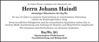 In tiefer Trauer nehmen wir Abschied von Herrn Johann Haindl ehemaliger Mitarbeiter der BayWa Er war 45 Jahre in unserem Unternehmen in verschiedenen Positionen, zuletzt als Tankwagenfahrer tätig. Seine beruflichen Fähigkeiten und die menschlichen Qualitäten haben ihm in reichem Maße Anerkennung und Achtung bei Kunden und Mitarbeitern eingebracht. Wir bewahren dem Verstorbenen ein ehrendes Gedenken. BayWa AG Spartenregion Niederbayern Geschäftsleitung und Belegschaft