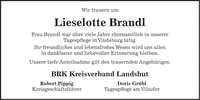 Wir trauern um Lieselotte Brandl Frau Brandl war über viele Jahre ehrenamtlich in unserer Tagespflege in Vilsbiburg tätig. Ihr freundliches und lebensfrohes Wesen wird uns allen in dankbarer und liebevoller Erinnerung bleiben. Unsere tiefe Anteilnahme gilt den trauernden Angehörigen. BRK Kreisverband Landshut Robert Pippig Doris Grübl Kreisgeschäftsführer Tagespflege am Vilsufer