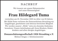 NACHRUF Wir trauern um unsere Fahnenmutter und unser Ehrenmitglied Frau Hildegard Tuma verstorben am 25. November 2025 im Alter von 93 Jahren. Mit Hilde Tuma verlieren die Donauschützen Straubing ein langjähriges, geschätztes und überaus herzliches Mitglied. Wir werden unserer 'Hilde' stets ein ehrendes Gedenken bewahren. Unsere Anteilnahme gilt ihren Kindern, Enkelkindern und allen übrigen Angehörigen. Donauschützengesellschaft 1926 Straubing e.V. Helmut Geiger, 1. Schützenmeister
