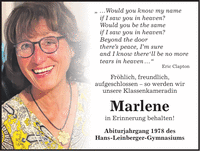 ' ...Would you know my name if I saw you in heaven? Would you be the same if I saw you in heaven? Beyond the door there's peace, I'm sure and I know there' ll be no more tears in heaven ...' Eric Clapton Fröhlich, freundlich, aufgeschlossen - so werden wir unsere Klassenkameradin Marlene in Erinnerung behalten! Abiturjahrgang 1978 des Hans-Leinberger-Gymnasiums