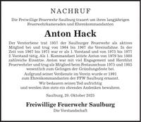 NACHRUF Die Freiwillige Feuerwehr Saulburg trauert um ihren langjährigen Feuerwehrkameraden und Ehrenkommandanten Anton Hack Der Verstorbene trat 1957 der Saulburger Feuerwehr als aktives Mitglied bei und trug von 1964 bis 1967 die Vereinsfahne. In der Zeit von 1967 bis 1971 war er als 1. Vorstand und von 1975 bis 1977 2. Vorstand tätig. Als 1. Kommandant leitete Anton von 1979 bis 1988 zahlreiche Einsätze. Anton war mit viel Engagement und Herzblut Feuerwehrler und trug als Mitglied beim Festausschuss 1975 und 1985 wesentlich zum Gelingen der Gründungsfeste bei. Aufgrund seiner Verdienste im Verein wurde er 1991 zum Ehrenkommandanten der FFW Saulburg ernannt. Wir bedauern seinen Tod aufrichtig und werden ihm stets ein ehrendes Andenken bewahren. Saulburg, 20. Oktober 2025 Freiwillige Feuerwehr Saulburg Die Vorstandschaft