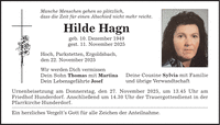Manche Menschen gehen so plötzlich, dass die Zeit für einen Abschied nicht mehr reicht. Hilde Hagn geb. 10. Dezember 1949 gest. 11. November 2025 Hoch, Parkstetten, Ergoldsbach, den 22. November 2025 Wir werden Dich vermissen Dein Sohn Thomas mit Martina Dein Lebensgefährte Josef Urnenbeisetzung am Donnerstag, den 27. November 2025, um 13.45 Uhr am Friedhof Hunderdorf. Anschließend um 14.30 Uhr der Trauergottesdienst in der Pfarrkirche Hunderdorf. Ein herzliches Vergelt's Gott für alle Zeichen der Anteilnahme. Deine Cousine Sylvia mit Familie und übrige Verwandtschaft