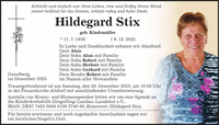 Schlicht und einfach war Dein Leben, treu und fleißig Deine Hand, immer helfend für die Deinen, schlafe ruhig und habe Dank. Hildegard Stix geb. Kindsmüller * 11. 7. 1938 + 9. 12. 2025 In Liebe und Dankbarkeit nehmen wir Abschied: Dein Alois Dein Sohn Alois mit Familie Dein Sohn Robert mit Familie Dein Sohn Herbert mit Familie Dein Sohn Gerhard mit Familie Dein Bruder Robert mit Familie im Namen aller Verwandten Trauergottesdienst ist am Samstag, den 20. Dezember 2025, um 10.00 Uhr in der Frauenkirche Altdorf mit anschließender Urnenbeisetzung. Anstelle von Kranz- und Blumenspenden bitten wir um eine Spende an die Kinderkrebshilfe Dingolfing-Landau-Landshut e.V., IBAN: DE***, Kennwort: Hildegard Stix. Für bereits erwiesene und noch zugedachte Anteilnahme sagen wir ein herzliches Vergelt's Gott.Ganslberg, im Dezember 2025