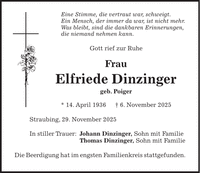 Eine Stimme, die vertraut war, schweigt. Ein Mensch, der immer da war, ist nicht mehr. Was bleibt, sind die dankbaren Erinnerungen, die niemand nehmen kann. Gott rief zur Ruhe Frau Elfriede Dinzinger geb. Poiger * 14. April 1936 + 6. November 2025 Straubing, 29. November 2025 In stiller Trauer: Johann Dinzinger, Sohn mit Familie Thomas Dinzinger, Sohn mit Familie Die Beerdigung hat im engsten Familienkreis stattgefunden.