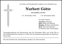 In Liebe und Dankbarkeit nehmen wir Abschied von Norbert Götte aus Landau a.d. Isar * 17. November 1939 _ 14. November 2025 Trauergottesdienst am Donnerstag, den 20. November 2025, um 14.00 Uhr in der Friedhofskirche Landau a.d. Isar. Die Urnenbeisetzung findet im Familienkreis statt. Für alle Zeichen der Anteilnahme danken wir sehr herzlich. In stiller Trauer: Anneliese, Ehefrau Fritz, Sohn mit Familie Monika, Tochter mit Familie Karl, Sohn mit Familie im Namen aller Verwandten