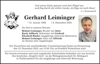 Und meine Seele spannte weit ihre Flügel aus und flog durch die stillen Lande, als flöge sie nach Haus'. J. v. Eichendorff Gerhard Leiminger * 21. Januar 1966 + 8. Dezember 2025 Du bist in unseren Herzen: Helmut Leiminger, Bruder mit Jutta Karin Adlhoch, Schwester mit Gerhard Elisabeth Binder, langjährige, liebevolle Betreuerin Helmut Leiminger, Vater mit Elfriede im Namen aller Angehörigen Die Trauerfeier mit anschließender Urnenbeisetzung findet am Donnerstag, den 18. Dezember 2025, um 13.00 Uhr im Friedhof Parkstetten statt. Für bereits erwiesene und noch zugedachte Anteilnahme bedanken wir uns herzlich. Ein herzliches 'Vergelt's Gott' an die Wohngemeinschaft St. Hildegard in Niederachdorf für die langjährige und liebevolle Betreuung.