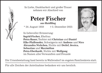In Liebe, Dankbarkeit und großer Trauer nehmen wir Abschied von Peter Fischer aus Haidlfing * 24. August 1950 + 5. Dezember 2025 In liebevoller Erinnerung: Ingrid Fischer, Ehefrau Petra Bauer, Tochter mit Christian und Daniel Elke Pfaffeneder, Schwägerin mit Andreas und Nico Alexandra Nickchen, Nichte mit Detlef, Jessica, Sebastian und Maximilian Petra Eberhardt, Nichte mit Wolfgang im Namen aller Verwandten und Freunde Die Urnenbestattung fand bereits in Wallersdorf im engsten Familienkreis statt. Für alle Zeichen der Anteilnahme bedanken wir uns herzlich.