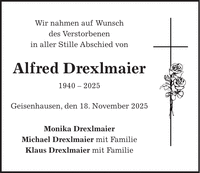 Wir nahmen auf Wunsch des Verstorbenen in aller Stille Abschied von Alfred Drexlmaier *** Geisenhausen, den 18. November 2025 Monika Drexlmaier Michael Drexlmaier mit Familie Klaus Drexlmaier mit Familie