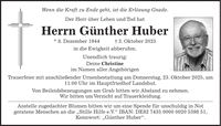 Wenn die Kraft zu Ende geht, ist die Erlösung Gnade. Der Herr über Leben und Tod hat Herrn Günther Huber * 8. Dezember 1944 + 3. Oktober 2025 in die Ewigkeit abberufen. Unendlich traurig: Deine Christine im Namen aller Angehörigen Trauerfeier mit anschließender Urnenbestattung am Donnerstag, 23. Oktober 2025, um 11.00 Uhr im Hauptfriedhof Landshut. Von Beileidsbezeugungen am Grab bitten wir Abstand zu nehmen. Wir bitten um Verzicht auf Trauerkleidung. Anstelle zugedachter Blumen bitten wir um eine Spende für unschuldig in Not geratene Menschen an die 'Stille Hilfe e.V.' IBAN: DE***, Kennwort: 'Günther Huber'.