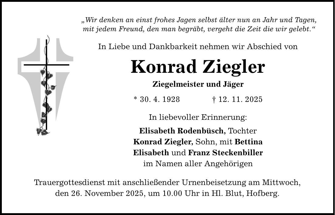 "Wir denken an einst frohes Jagen selbst älter nun an Jahr und Tagen, mit jedem Freund, den man begräbt, vergeht die Zeit die wir gelebt." In Liebe und Dankbarkeit nehmen wir Abschied von Konrad Ziegler Ziegelmeister und Jäger * 30. 4. 1928 _ 12. 11. 2025 In liebevoller Erinnerung: Elisabeth Rodenbüsch, Tochter Konrad Ziegler, Sohn, mit Bettina Elisabeth und Franz Steckenbiller im Namen aller Angehörigen Trauergottesdienst mit anschließender Urnenbeisetzung am Mittwoch, den 26. November 2025, um 10.00 Uhr in Hl. Blut, Hofberg.