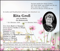 In Liebe und Dankbarkeit nehmen wir Abschied von Rita Groß geb. Freidhöfer aus Hohenwarth * 20. Oktober 1936 + 6. Oktober 2025 Dein Sohn Karl mit Susanne Deine Tochter Gerda mit Franz Deine Enkel Johanna mit Uli Susanne und Ida Sebastian mit Manuela, Hannes und Jakob Florian mit Steffi Verena mit Michael Katharina mit Andi Requiem mit anschließender Urnenbeisetzung am Mittwoch, den 22. Oktober 2025, um 15.00 Uhr in der Pfarrkirche Hohenwarth. Für jeden Trost, für jede Umarmung, ein herzliches 'Vergelt's Gott'.Du hast gelebt für Deine Lieben. All' Deine Müh' und Arbeit war für sie. Nun ruhst Du in Frieden. In unseren Herzen stirbst Du nie.