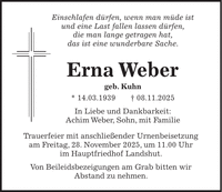 Einschlafen dürfen, wenn man müde ist und eine Last fallen lassen dürfen, die man lange getragen hat, das ist eine wunderbare Sache. Erna Weber geb. Kuhn * 14.03.1939 + 08.11.2025 In Liebe und Dankbarkeit: Achim Weber, Sohn, mit Familie Trauerfeier mit anschließender Urnenbeisetzung am Freitag, 28. November 2025, um 11.00 Uhr im Hauptfriedhof Landshut. Von Beileidsbezeigungen am Grab bitten wir Abstand zu nehmen.