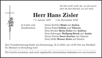 Du bist nicht mehr da, wo du warst, aber du bist überall, wo wir sind. Herr Hans Zisler * 5. Januar 1937 + 24. November 2025 In Liebe und Deine Tochter Birgit mit Jochen Dankbarkeit: Deine Enkel Fabian und Viktoria Dein Bruder Heinz Zisler mit Andreas Dein Schwager Wolfgang Bruck mit Armin Deine Nichte Doris Stettner mit Familie Dein Neffe Werner Zisler mit Famile Die Urnenbeisetzung findet am Donnerstag, 18.12.2025, um 14.00 Uhr am Friedhof St. Michael in Straubing statt. Für bereits erwiesene und noch zugedachte Anteilnahme bedanken wir uns herzlich.