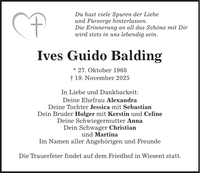 Du hast viele Spuren der Liebe und Fürsorge hinterlassen. Die Erinnerung an all das Schöne mit Dir wird stets in uns lebendig sein. Ives Guido Balding * 27. Oktober 1968 + 19. November 2025 In Liebe und Dankbarkeit: Deine Ehefrau Alexandra Deine Tochter Jessica mit Sebastian Dein Bruder Holger mit Kerstin und Celine Deine Schwiegermutter Anna Dein Schwager Christian und Martina Im Namen aller Angehörigen und Freunde Die Trauerfeier findet auf dem Friedhof in Wiesent statt.