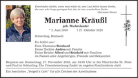 Einschlafen dürfen, wenn man müde ist, eine Last fallen lassen dürfen, die man sehr lange getragen hat, das ist eine wunderbare Sache. (Hermann Hesse) Marianne Kräußl geb. Wocheslander * 2. Juni 1950 _ 27. Oktober 2025 Schierling, Rimbach Du fehlst uns! Dein Ehemann Bernhard Deine Tochter Andrea mit Familie Deine Brüder Alfred und Reinhold mit Familien im Namen aller Angehörigen, Freunde und Bekannten Requiem am Donnerstag, 27. November 2025, um 14.00 Uhr in der Pfarrkirche St. Peter und Paul in Schierling. Die Urnenbeisetzung findet im engsten Familienkreis statt. Ein herzliches "Vergelt's Gott" für alle Zeichen der Anteilnahme.