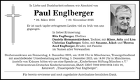 In Liebe und Dankbarkeit nehmen wir Abschied von Paul Englberger * 22. März 1956 _ 20. November 2025 Er ist nach tapfer ertragenem Leiden viel zu früh von uns gegangen. In lieber Erinnerung: Rita Englberger, Ehefrau Daniela Hörmannskirchner, Tochter, mit Klaus, Julia und Lisa Christian Englberger, Sohn, mit Susanne, Jakob und Theresa Josef Englberger, Bruder, mit Familie im Namen aller Verwandten Sterberosenkranz am Donnerstag, 4. Dezember 2025, um 18.00 Uhr in Münchnerau, Trauergottesdienst mit anschließender Urnenbestattung am Freitag, 5. Dezember 2025, um 14.00 Uhr in Münchnerau. Anstelle von Kränzen bitten wir um eine Spende an "Kinderherzen Stiftung München e. V." Förderzentrum Deutsches Kinderherzzentrum, IBAN: DE***, Kennwort: "Trauerspende Paul Englberger". Für bereits erwiesene und noch zugedachte Anteilnahme herzlichen Dank.