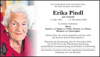 Ich verabschiede mich und danke allen, die mich mochten und liebten! Erika Pindl geb. Schmidt * 5. Mai 1932 + 3. November 2025 In stillem Gedenken: Maria Katrin und Simon mit Felix, Florian und Simon Michael und Christopher Danke allen, die meiner gedenken und die mich auf meinem letzten Weg begleiten. Requiem am Donnerstag, den 20. November 2025, um 14.00 Uhr in der Pfarrkirche Schierling, anschließend Urnenbeisetzung am Friedhof in Schierling. Für bereits erwiesene und noch zugedachte Anteilnahme bedanken wir uns herzlich.