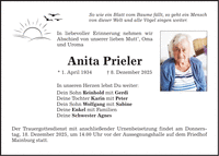 So wie ein Blatt vom Baume fällt, so geht ein Mensch von dieser Welt und alle Vögel singen weiter. In liebevoller Erinnerung nehmen wir Abschied von unserer lieben Mutt', Oma und Uroma Anita Prieler * 1. April 1934 _ 8. Dezember 2025 In unseren Herzen lebst Du weiter: Dein Sohn Reinhold mit Gerdi Deine Tochter Karin mit Peter Dein Sohn Wolfgang mit Sabine Deine Enkel mit Familien Deine Schwester Agnes Der Trauergottesdienst mit anschließender Urnenbeisetzung findet am Donnerstag, 18. Dezember 2025, um 14.00 Uhr vor der Aussegnungshalle auf dem Friedhof Mainburg statt.