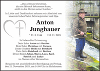 'Das schönste Denkmal, das ein Mensch bekommen kann, steht in den Herzen seiner Lieben.' In Liebe und Dankbarkeit nehmen wir Abschied von unserem lieben Vater, Schwiegervater und Opa Anton Jungbauer * 21. 3. 1944 + 13. 11. 2025 In liebevoller Erinnerung: Dein Sohn Anton mit Bettina Dein Sohn Christian mit Carmen Deine Tochter Heidi mit Bernhard Dein Sohn Reinhard mit Bettina Deine Enkel Julian, Marco, Luca, Karl, Patrick und Lukas im Namen aller Verwandten Requiem mit anschließender Beerdigung am Freitag, den 21. November 2025, um 14.00 Uhr in Holzhausen.