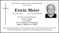 Nach einem erfüllten Leben verabschieden wir uns von Erwin Meier * 20. April 1934 + 21. November 2025 In Liebe und Dankbarkeit: Ehefrau Anna Sohn Peter Tochter Kristina mit Wolfgang, Julia mit Manuel und Noah Der Trauergottesdienst ist am Samstag, den 6. Dezember 2025, um 11 Uhr in der Frauenkirche in Altdorf, anschließend Urnenbeisetzung.