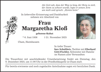Als Gott sah, dass der Weg zu lang, der Berg zu steil, der Atem zu schwer wurde, legte er seinen Arm um mich und sprach: "Komm heim" In liebevoller Erinnerung und Dankbarkeit nehmen wir Abschied von Frau Margaretha Kloß geborene Kubat * 6. Juni 1936 _ 21. November 2025 Cham, Haimhausen Die Trauerfeier mit anschließender Urnenbeisetzung findet am Dienstag, den 9. Dezember 2025, um 11.00 Uhr in der Friedhofskapelle in Cham statt. Für bereits erwiesene und noch zugedachte Anteilnahme sagen wir herzlichen Dank. In tiefer Trauer: Ines Schultheis, Tochter mit Eberhard Gitti Fischler, Schwester mit Familie im Namen aller Verwandten