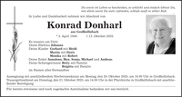 Du warst im Leben so bescheiden, so schlicht und einfach lebtest Du, mit allem warst Du stets zufrieden, schlafe sanft in stiller Ruh. In Liebe und Dankbarkeit nehmen wir Abschied von Konrad Donharl aus Großköllnbach * 3. April 1940 + 13. Oktober 2025 Es trauern um Dich: Deine Ehefrau Johanna Deine Kinder Gerhard mit Heidi Martin mit Doris Monika mit Robert Deine Enkel Annalena, Max, Sonja, Michael und Andreas Deine Schwägerinnen Betty mit Familie Brigitta mit Familie im Namen aller Verwandten Aussegnung mit anschließendem Sterberosenkranz am Montag, den 20. Oktober 2025, um 18.00 Uhr in Großköllnbach. Trauergottesdienst am Dienstag, den 21. Oktober 2025, um 14.00 Uhr in der Pfarrkirche in Großköllnbach mit anschließender Beerdigung. Für bereits erwiesene und noch zugedachte Anteilnahme bedanken wir uns herzlich.