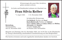 Erinnerungen die unser Herz berühren, gehen niemals verloren. In Liebe und Dankbarkeit nehmen wir Abschied von Frau Silvia Reiber * 2. April 1945 + 15. November 2025 In liebevoller Erinnerung: Ute Kolbeck, Tochter, mit Josef Karin Rückwardt, Tochter, mit Helmut Enkel: Stefan, Julia mit Lukas, Tobias mit Melina, Rottenburg, Alexander mit Jennifer Oberhatzkofen, Urenkel: Louisa, Lia den 22. November 2025 im Namen aller Verwandten Requiem am Dienstag, den 25. November 2025, um 14.30 Uhr in der Pfarrkirche St. Georg in Rottenburg, anschließend Urnenbeisetzung auf dem Bergfriedhof. Für bereits erwiesene und noch zugedachte Anteilnahme danken wir herzlich.