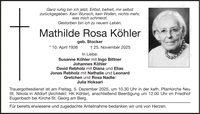Ganz ruhig bin ich jetzt. Erlöst, befreit, mir selbst zurückgegeben. Kein Wunsch, kein Wollen, nichts mehr, was mich schmerzt. Gestorben bin ich zu neuem Leben. Mathilde Rosa Köhler geb. Stocker * 10. April 1936 + 25. November 2025 In Liebe: Susanne Köhler mit Ingo Bittner Johannes Köhler David Rebholz mit Diana und Elias Jonas Rebholz mit Nathalie und Leonard Gretchen und Rosa Nadler Julia Hoksari Trauergottesdienst ist am Freitag, 5. Dezember 2025, um 10.30 Uhr in der kath. Pfarrkirche Neu St. Nikola in Altdorf (Architekt: HK Köhler), anschließend Beerdigung um 12.00 Uhr im Friedhof Eugenbach bei Kirche St. Georg am Berg. Für bereits erwiesene und zugedachte Anteilnahme bedanken wir uns von Herzen.