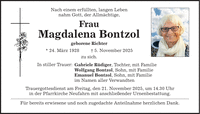 Nach einem erfüllten, langen Leben nahm Gott, der Allmächtige, Frau Magdalena Bontzol geborene Richter * 24. März 1928 _ 5. November 2025 zu sich. In stiller Trauer: Gabriele Rüdiger, Tochter, mit Familie Wolfgang Bontzol, Sohn, mit Familie Emanuel Bontzol, Sohn, mit Familie im Namen aller Verwandten Trauergottesdienst am Freitag, den 21. November 2025, um 14.30 Uhr in der Pfarrkirche Neufahrn mit anschließender Urnenbestattung. Für bereits erwiesene und noch zugedachte Anteilnahme herzlichen Dank.