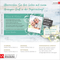 * Abbildungen in Originalgröße _ Preise inkl. MwSt.Jetzt auch online bequem gestalten und buchen: anz.idowa.de/herzlicheAnzeigenservice Landshut Altstadt *** Landshut Telefon: *** Fax: *** anzeigen@landshuter-zeitung.deVilsbiburg Telefon: *** Mainburg Telefon: ***Moosburg Telefon: *** Rottenburg Telefon: ***-spaltig/50 mm EUR 59,50MIT FOTO!BEISPIEL*
