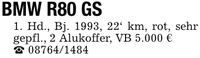 BMW R80 GS1. Hd., Bj. 1993, 22' km, rot, sehr gepfl., 2 Alukoffer, VB 5.000 €_ ***