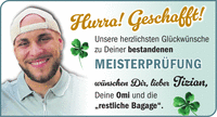Unsere herzlichsten Glückwünsche zu Deiner bestandenen Meisterprüfung wünschen Dir, lieber Tizian, Deine Omi und die 'restliche Bagage'.Hurra! Geschafft!