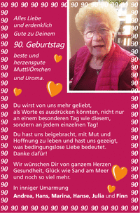 Alles Liebe und erdenklich Gute zu Deinem 90. Geburtstag beste und herzensgute Muttl/Ömchen und Uroma. Du wirst von uns mehr geliebt, als Worte es ausdrücken könnten, nicht nur an einem besonderen Tag wie diesem, sondern an jedem einzelnen Tag! Du hast uns beigebracht, mit Mut und Hoffnung zu leben und hast uns gezeigt, was bedingungslose Liebe bedeutet. Danke dafür! Wir wünschen Dir von ganzem Herzen Gesundheit, Glück wie Sand am Meer und noch so viel mehr. In inniger Umarmung Andrea, Hans, Marina, Hanse, Julia und Finn***