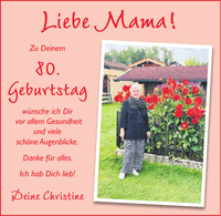 Liebe Mama! Zu Deinem 80. Geburtstag wünsche ich Dir vor allem Gesundheit und viele schöne Augenblicke. Danke für alles. Ich hab Dich lieb! Deine Christine
