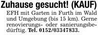 Zuhause gesucht! (KAUF)EFH mit Garten in Furth im Wald und Umgebung (bis 15 km). Gerne renovierungs- oder sanierungsbedürftig. Tel. ***.