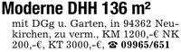 Moderne DHH 136 m² mit DGg u. Garten, in 94362 Neukirchen, zu verm., KM 1200,-€ NK 200,-€, KT 3000,-€, _ ***