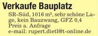 Verkaufe BauplatzSR-Süd, 1016 m², sehr schöne Lage, kein Bauzwang, GFZ 0,4Preis a. Anfragee-mail: rupert.dietl@t-online.de