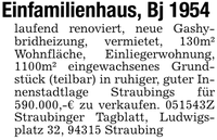 Einfamilienhaus, Bj 1954 laufend renoviert, neue Gashybridheizung, vermietet, 130m² Wohnfläche, Einliegerwohnung, 1100m² eingewachsenes Grundstück (teilbar) in ruhiger, guter Innenstadtlage Straubings für 590.000,-€ zu verkaufen. ***Z Straubinger Tagblatt, Ludwigsplatz 32, 94315 Straubing