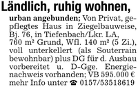 Ländlich, ruhig wohnen, urban angebunden; Von Privat, gepflegtes Haus in Ziegelbauweise, Bj. 76, in Tiefenbach/Lkr. LA,760 m² Grund, Wfl. 140 m² (5 Zi.), voll unterkellert (als Souterrain bewohnbar) plus DG für d. Ausbau vorbereitet u. D-Gge. Energienachweis vorhanden; VB 595.000 € mehr Info unter _ ***