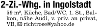 2-Zi.-Whg. in Ingolstadt59 m², Küche, Bad/WC, 1. St., Balkon, nähe Audi, v. priv. an privat, VB, _ richtrose@yahoo.de