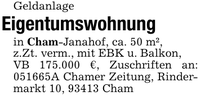 GeldanlageEigentumswohnungin Cham-Janahof, ca. 50 m²,z.Zt. verm., mit EBK u. Balkon,VB 175.000 €, Zuschriften an: ***A Chamer Zeitung, Rindermarkt 10, 93413 Cham