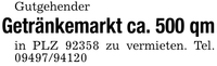 GutgehenderGetränkemarkt ca. 500 qmin PLZ 92358 zu vermieten. Tel. ***