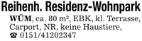 Reihenh. Residenz-WohnparkWÜM, ca. 80 m², EBK, kl. Terrasse, Carport, NR, keine Haustiere, _ ***