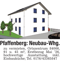 Pfaffenberg: Neubau-Whg.zu vermieten, Ortszentrum 84066, 91 u. 45 m², Erstbezug Mai '26, hochwertige Ausstattung, inkl. Einbauküche; Tel. ***